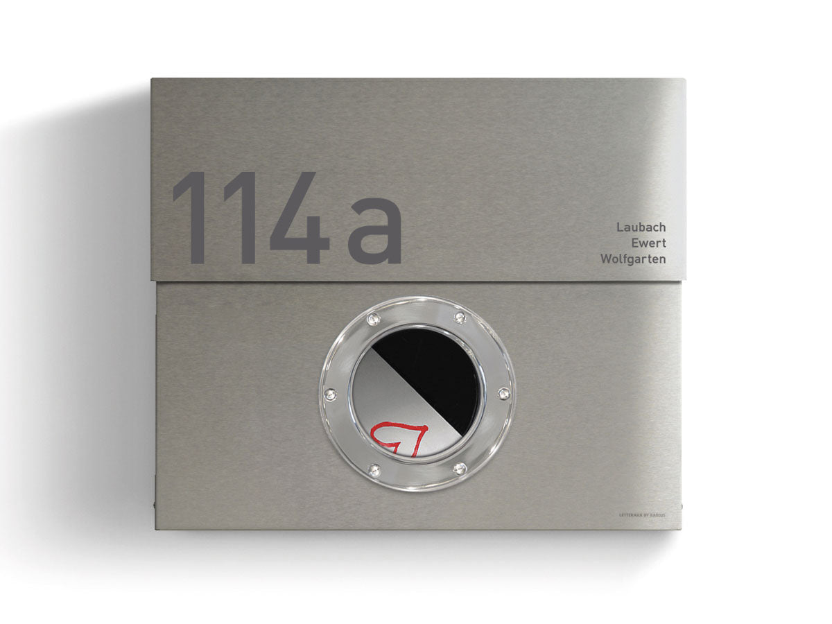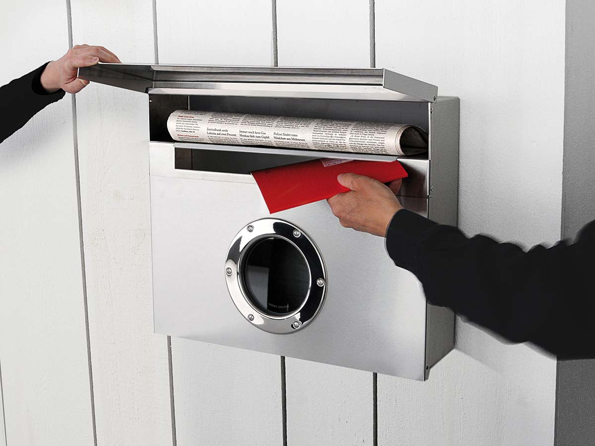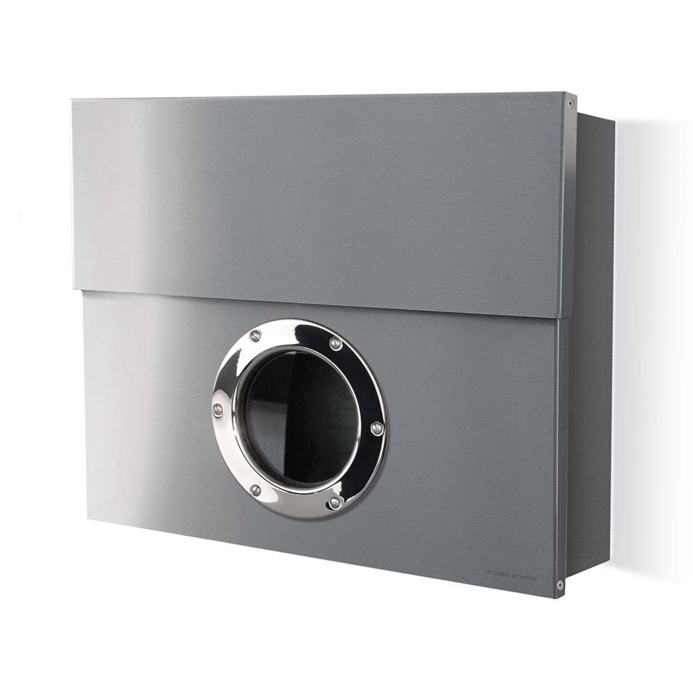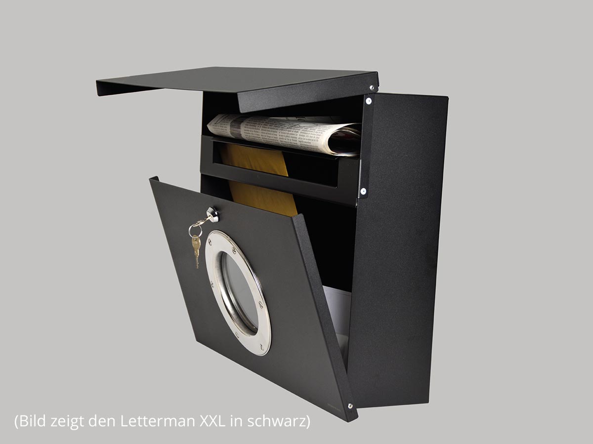 Perfektion im Detail: Der neue Briefkasten Letterman XXL aus Edelstahl hat mächtig was unter der Haube! Unter der großzügigen oberen Klappe befindet sich ein praktisches Fach für Zeitungen und Zeitschriften sowie ein ein großzügig dimensionierter Einwurfschlitz für Briefe und ähnliches. So ist alles im Großformat vor Wind und Wetter geschützt. Das markante Bullauge macht den Briefkasten zu einem echten Hingucker – und ist praktisch dazu. Verrät es doch auf einen Blick, ob der heiß ersehnte Loveletter schon angekommen ist.